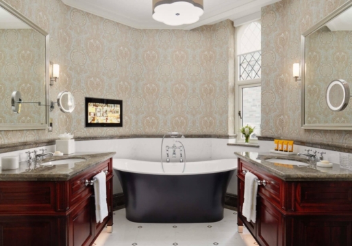 The lavish Signature Suites are the pinnacle of graceful living at Adare Manor, where the aristocratic legacy of the Manor House lives on in every luxurious detail. Offering a palatial 1076 square feet/100 square metres of space, your indulgent suite features countless thoughtful touches to make your stay with us an experience you will remember forever. Lose yourself in the ultimate comfort of your expansive king-sized bed for a deeply restorative night’s sleep in the peace and quiet of the Irish countryside. Relax in your spacious private sitting room with refreshments from your complimentary minibar, restocked daily with your favourite soft drinks and nibbles. Perfectly appointed and exquisitely designed, in a Signature Suite there is something beautiful to behold everywhere the eye rests. It’s an invitation to slow down and savour the gorgeous surroundings: historical tapestry wall hangings, original 19th century art, elegant Georgian-inspired furniture and just outside the window, spectacular views of the formal French Gardens, the peacefully flowing River Maigue, our glorious Tom Fazio designed championship golf course, or the tranquil Beechwalk.